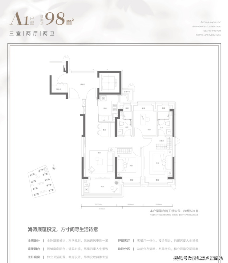 官方户型图如下:约98㎡3房2卫,非常标准的微改善户型。