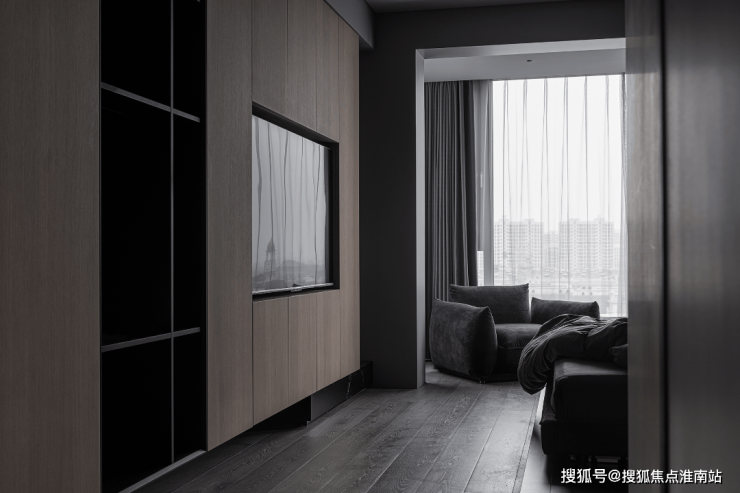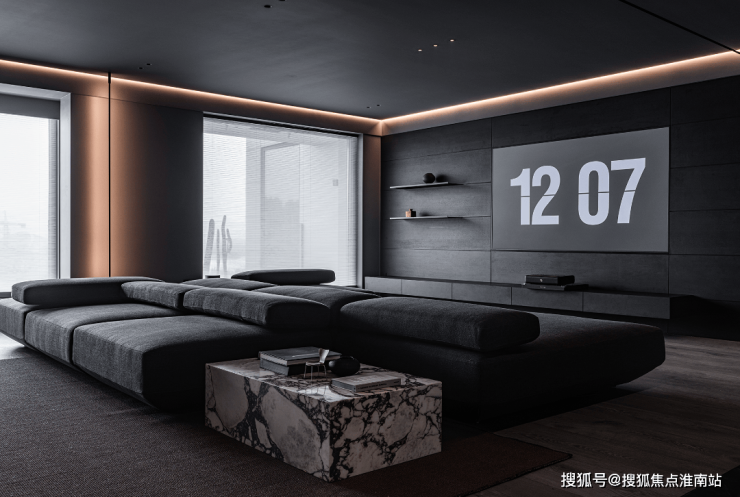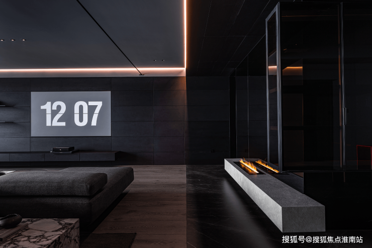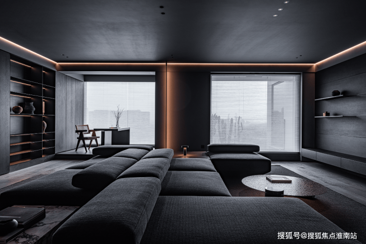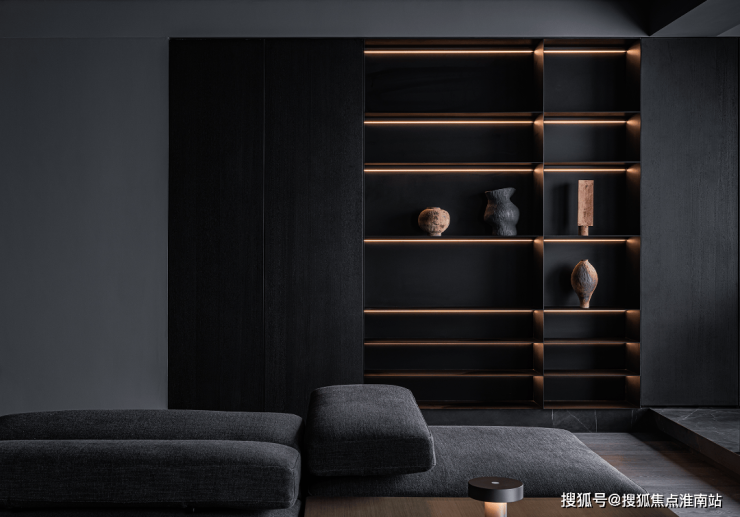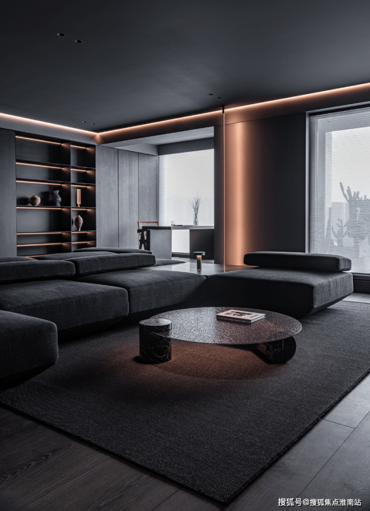 黑色所代表的并非是绝望和深渊,黑色在这个室内象征着宁静和整洁,以高度的统一感创造空间的和谐,打造了高品质的居所,规整的沙发、地毯以及嵌入墙体的壁龛,都汇集于此,用品质诉说着家的整洁。