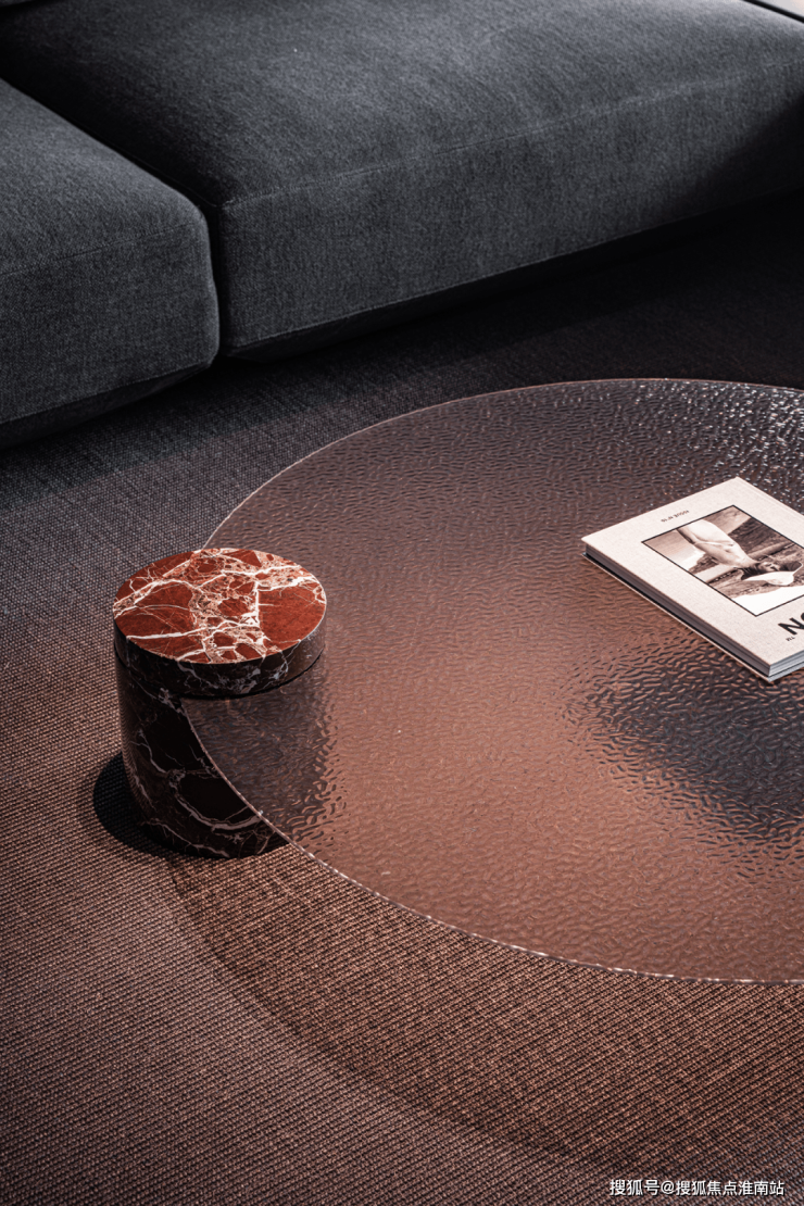 磨砂材质的茶几桌面在黄色灯光的晕染下,逐渐染上了夕阳的浪漫,为室内注入了更多的诗意美好,这种浪漫一圈圈的扩散到了家的每一个角落中。