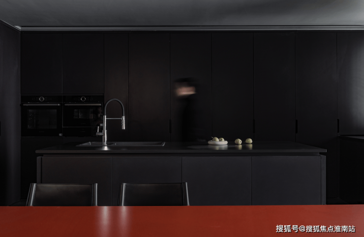 餐厨区选用了一体化的设计,让家的状态更加的融合,红色的餐桌犹如钻石一般耀眼,在黑色的居所中大胆的展示着自己惊艳的魅力,悄然之中为家融入了更多的艺术感。