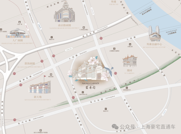 作为 上海的绝对市心 , 露香园直线距离人民广场、淮海路、外滩、豫园等上海市地标性区域均不超过1.5公里 ,距离陆家嘴直线约2公里。