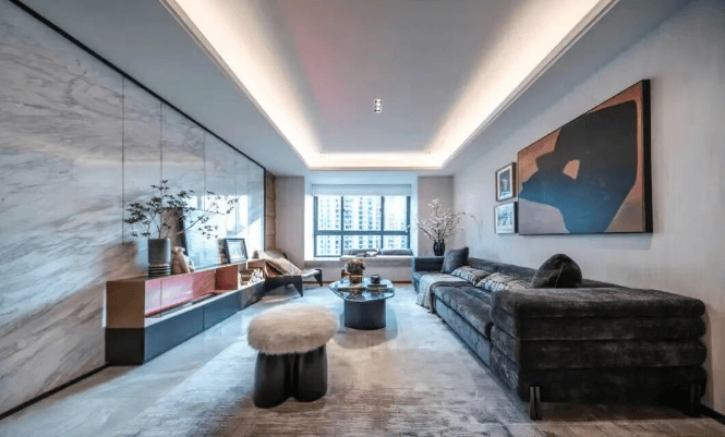 建筑风格:现代简约,外立面采用灰色天然砂岩板+浅色真石漆,质感稳重
