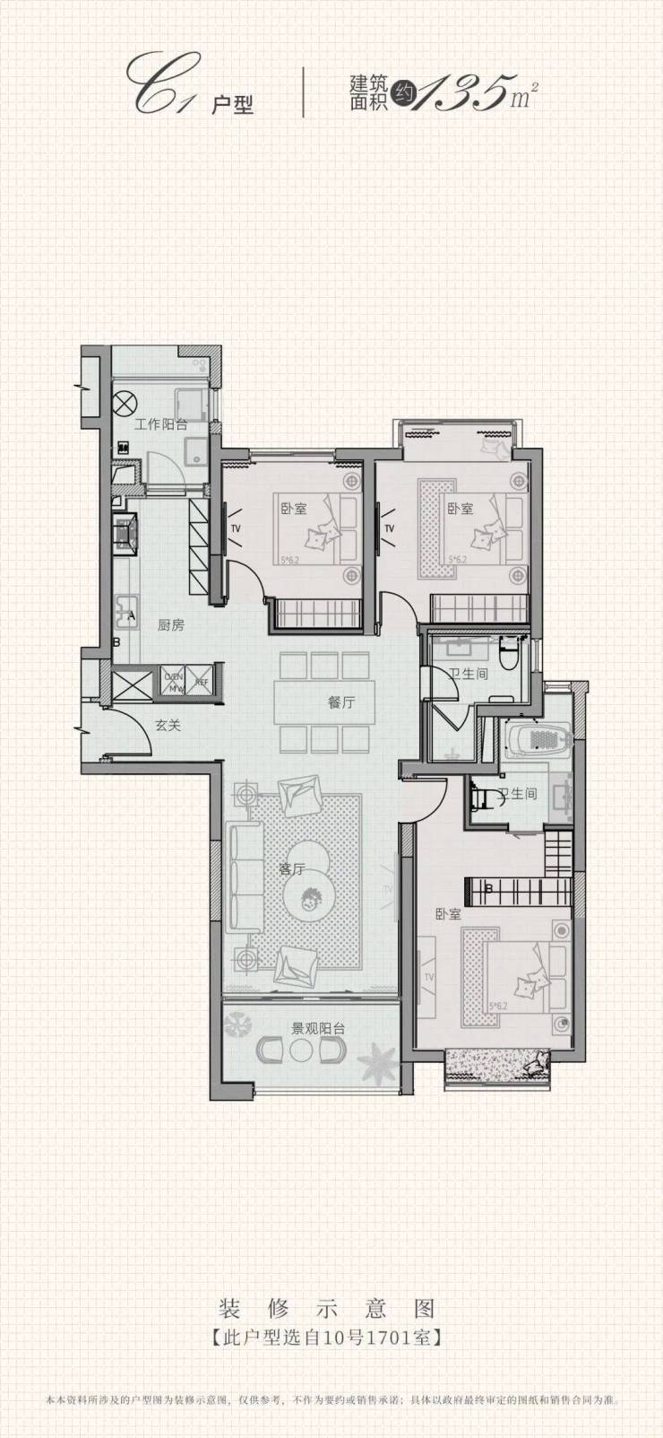 135㎡三房:总价约1590万–1650万,南北通透,主卧套房+衣帽间,三开间朝南