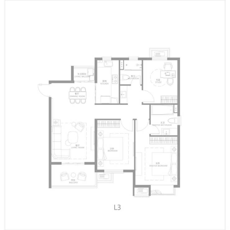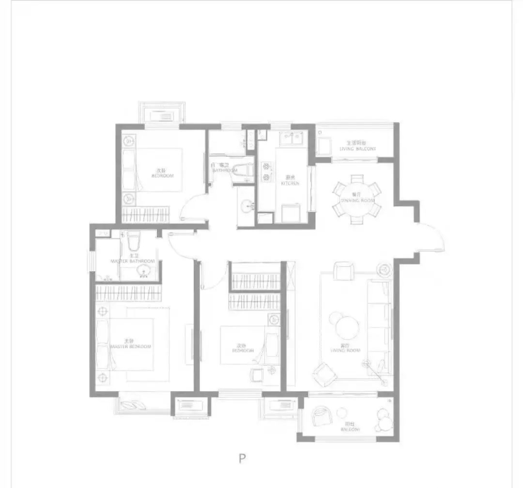 建面约125㎡三房两厅两卫,南北通透,户型方正,主卧大套房,带阳台与独立主卫,更舒适的居住尺度。