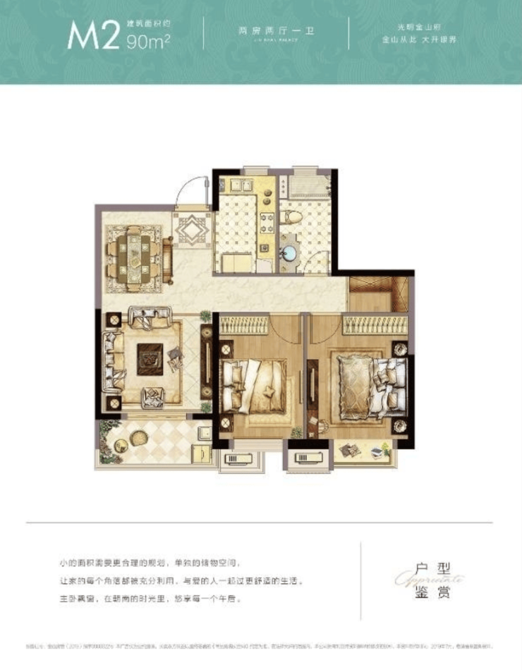 建面约90㎡2房2厅1卫,两间卧室朝南,舒适尺度搭配观景阳台,干湿分离的独立卫浴。
