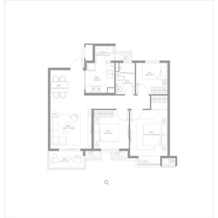 建面约116㎡三房两厅两卫,南北通透,户型方正,主卧大套房,带阳台与独立主卫,更舒适的居住尺度。