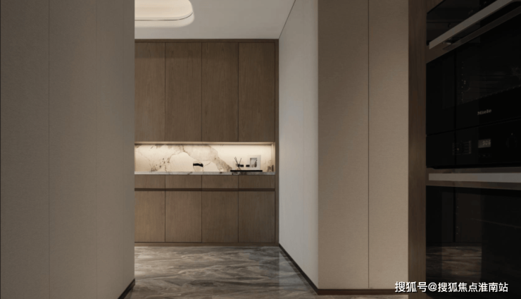 明华誉港城售楼处电话☎:400-998-9694✔✔ 白色的岩板与桃木背景墙让人联想到枫丹白露宫殿的动人秋天。打造生活中的高级感不需要繁琐复杂的浮夸装饰,而是要在空间之内做减法。深色与浅色的交叠呼应之间,让曲线与直线共同构建空间的秩序,匹配房间整体弧形外观,打造内部张弛有度、流畅自如的线条感。