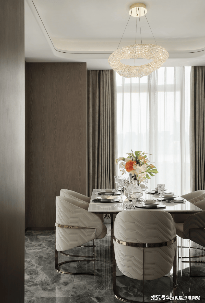 开放的客餐厅打破桎梏,餐桌选择了金属与石材结合的独特设计。在完美的采光环境下,让每一次品尝美食的过程也充满仪式感。水纹座椅呼应房间临江主题,让浮动的波纹化为稳固的装饰,承托住和家人一起分享的美好回忆。