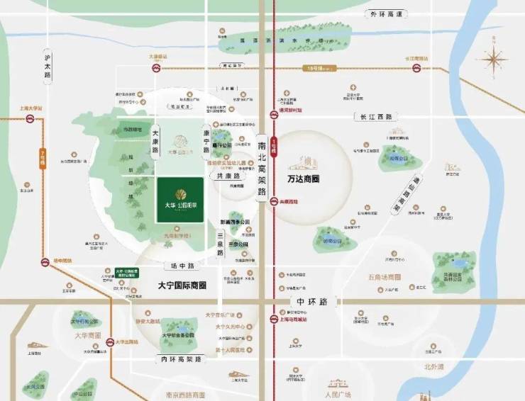 大华公园城市 位于宝山区康宁路长江西路,属中外环间,项目距离1号线通河新村站约1.4公里,可一线直达人民广场、淮海路、徐家汇、莘庄等CBD;距离“换乘王”之称的18号线康宁路站仅约500米。