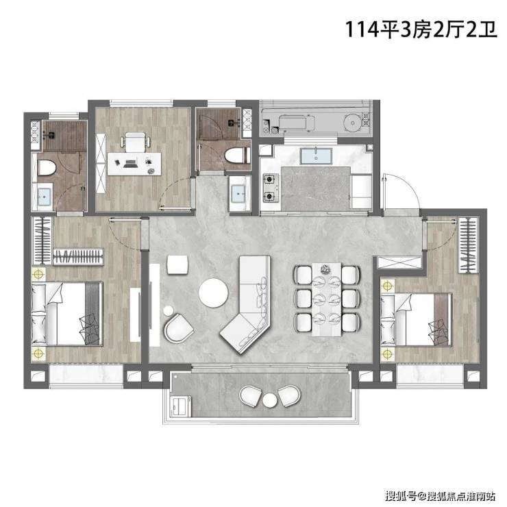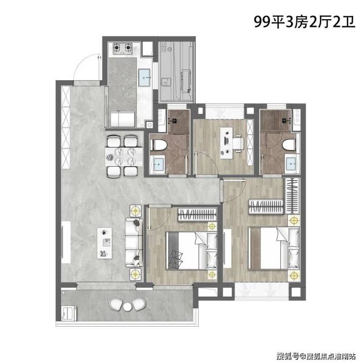 城投悦江湾售楼处电话:400-891-9910✔✔✔建面约99㎡3室2厅2卫户型,做到了三开间朝南+超大阳台+动静分离+主卧套房设计,延伸了室内实际可使用面积,采光、通透性都非常不错。