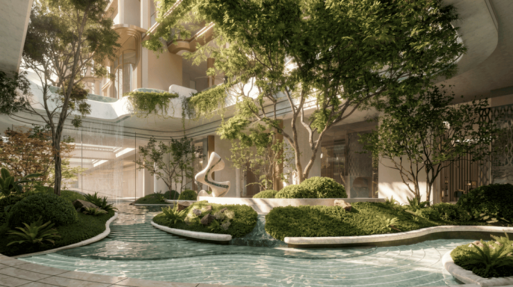 项目在抬板设计之余,还利用抬升形成的台地空间,来打造下沉式庭院,通过叠水、绿植的搭配,形成立体景观,这种一步一景的沉浸式森系园林,进一步体现项目自身森系园林景观。