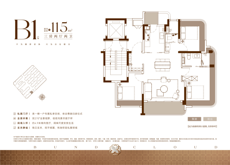 115㎡ 3 房 2 厅 2 卫:独立玄关、4.9 米宽厅、270° 观景;单价 12.1-13.5 万 /㎡,总价 1380-1550 万
