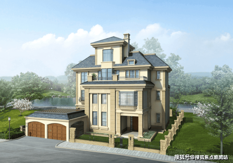 采用蓝灰色屋顶、淡黃、米黄色石材,呈现法式尊贵风格,也是坡顶设计,占据白塘河公园一线景观,前后庭院、阳台、露台、入口门廊搭配景观花架。