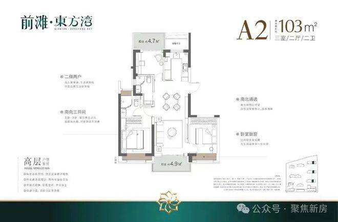 建面103㎡3房2厅2卫,户型三开间朝南、室内“5个飘窗+2阳台”,不管是采光、视野、通风、私密性,还是实用性都十分出色。