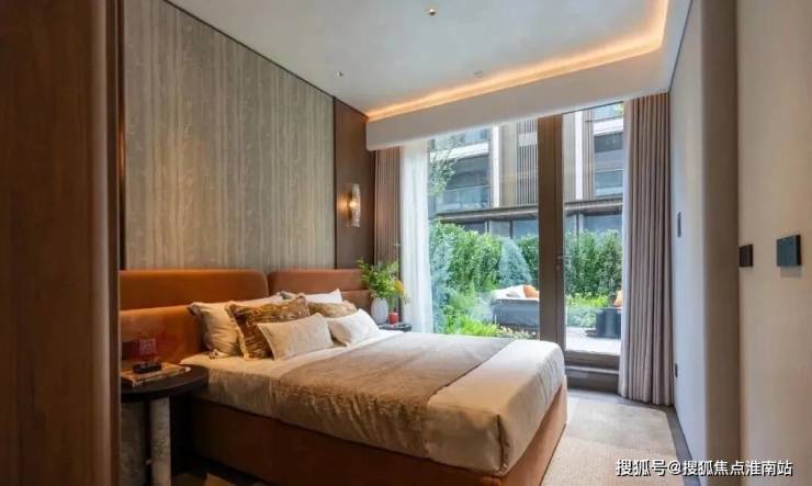 庭院中央采用巴西进口亚马逊绿奢石打造的流水景台,单价高达约4000元/㎡,配合灵感源自复兴公园紫藤廊架的景墙,潺潺水声与静谧光影,共同凝筑成一个静谧诗意的角落(项目红线外不作为交付承诺)