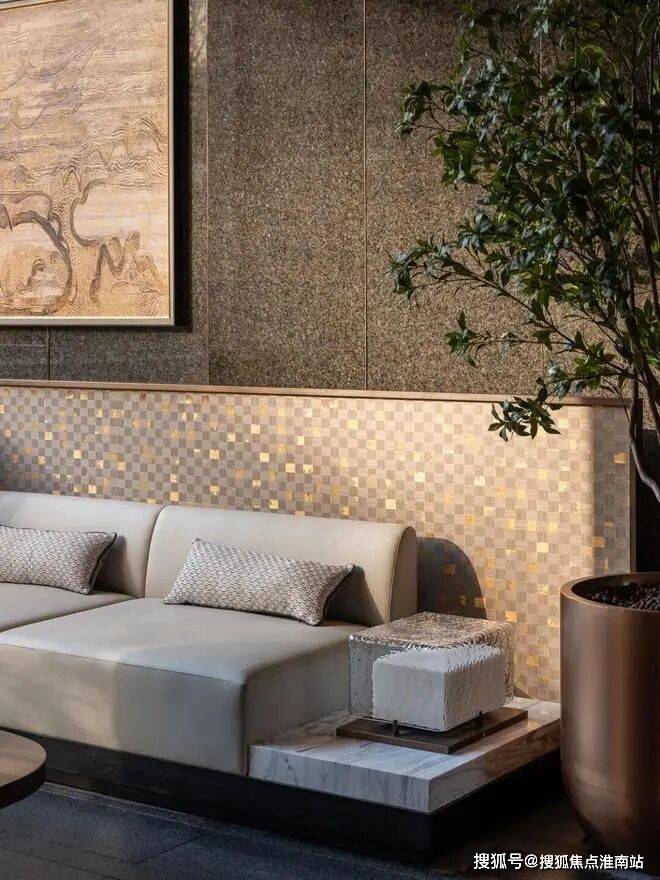 黄金丝绸大理石流转着真丝般的光泽,白玉与卡里冰玉小台映照天光云影。