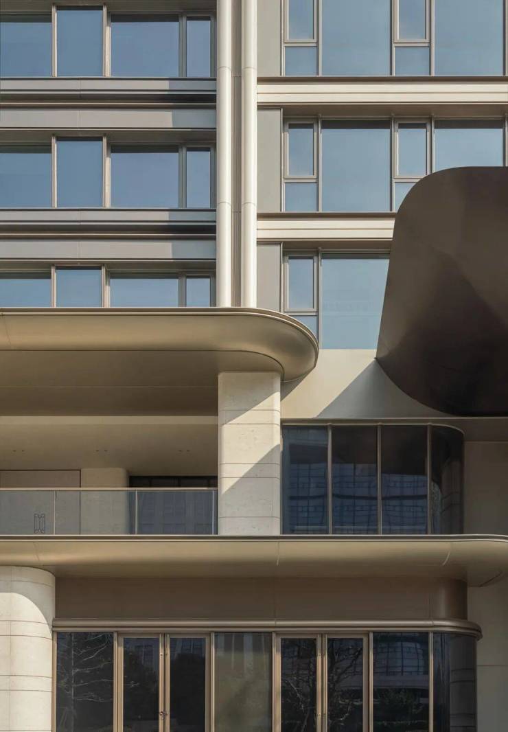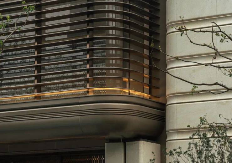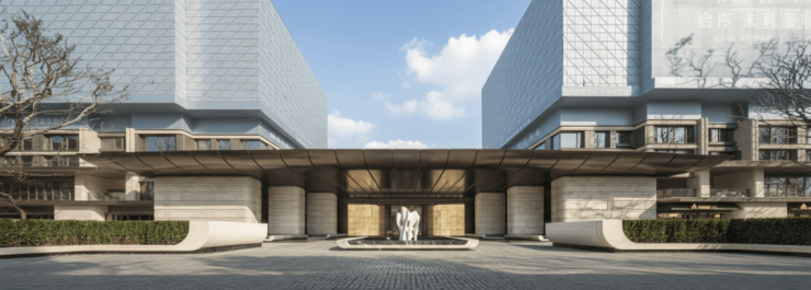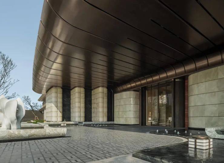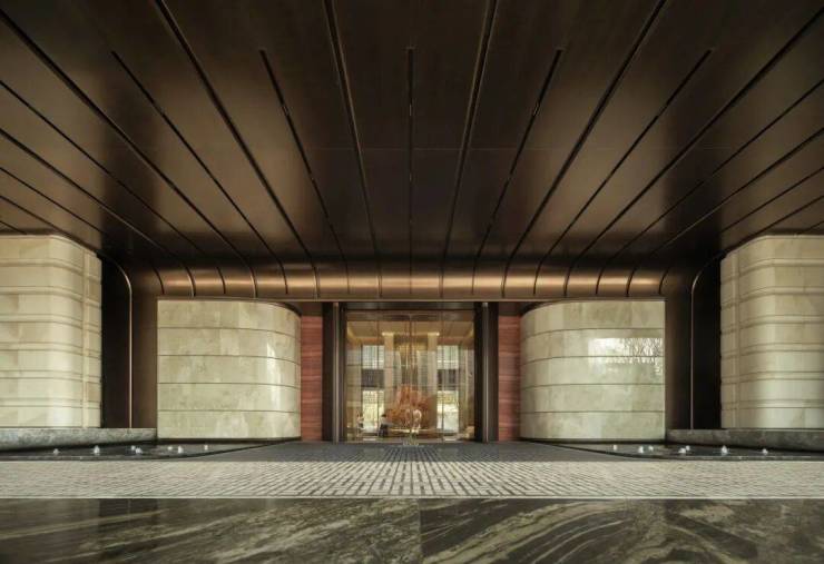 在城市与社区的接驳地带,我们希望以一道“会呼吸的烟火幕墙”重新定义了上盖型物业的界面。主入口以杭州博物馆镇馆之宝“玉琮”为设计原型,将其转译为序列化的柱式与石台。