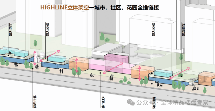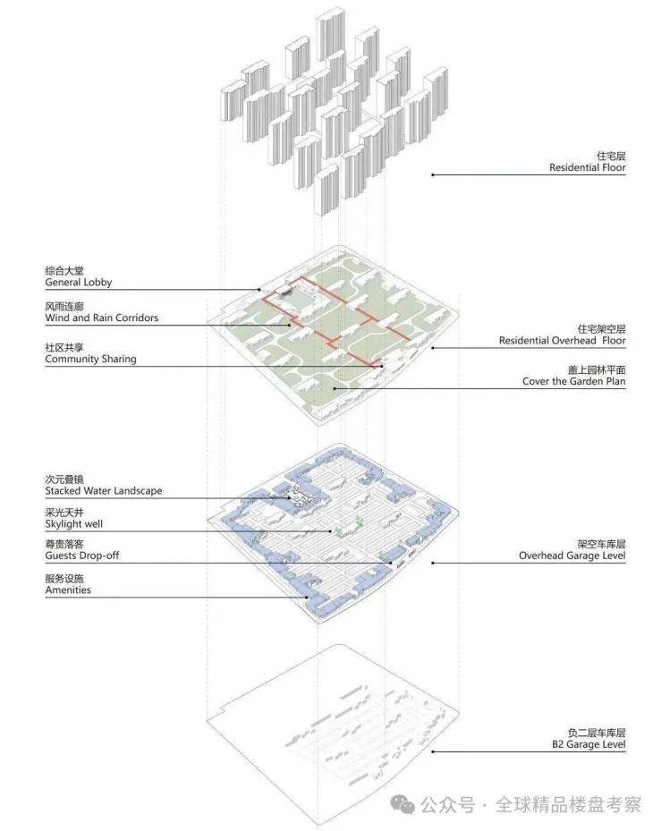 为彻底消融城市与社区的界限,项目以“超级底盘”重构社区基座。通过抬高地库、整合车站与商业配套,将地下空间转化为多功能垂直枢纽。