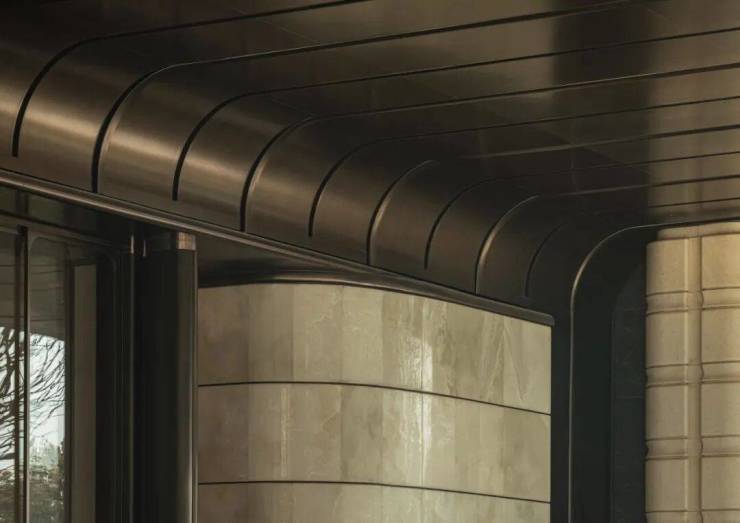 立面格栅系统直接受伞骨结构启发,以金属构件构建秩序性的韵律。这些格栅不仅是装饰要素,更是整合遮阳、滤光与立面模数化的功能体系。其精密排布与细微起伏模拟了伞骨的实际构造,体现出“技术诗意”的建构表达。