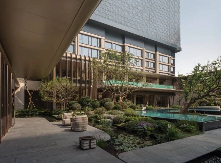 庭院景观以西湖荷花为核心设计元素之一,水桥的形态则借鉴并转译西溪湿地的自然肌理,使整体空间在文化意象与自然特征之间建立关联。