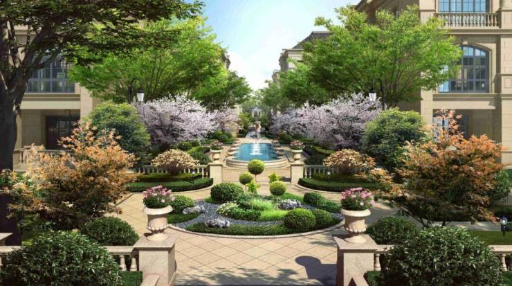 整个园区,以经典的绿城法式墅区景观大中轴贯穿细节部位使用