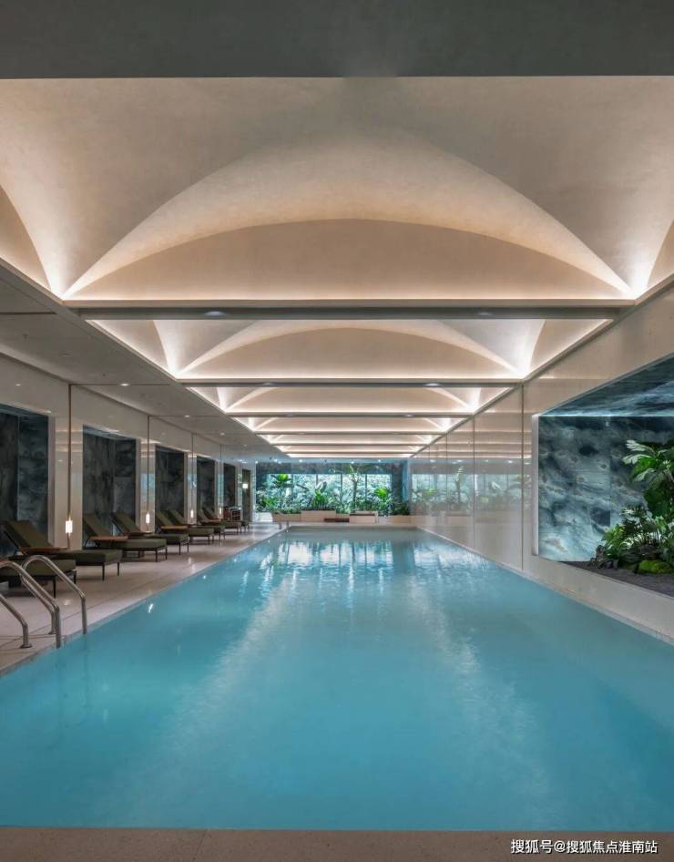 豪宅中,会所+泳池已经成为市场标配。但是万科中興傲舍,真正做到了 “把艺术作为生活的一部分” 。植物园泳池放在了2楼,选用了皮革面的绿色石材,营造一种树影斑驳的感觉。里面的绿植不是装饰,都是鲜活的、精心照养的。
