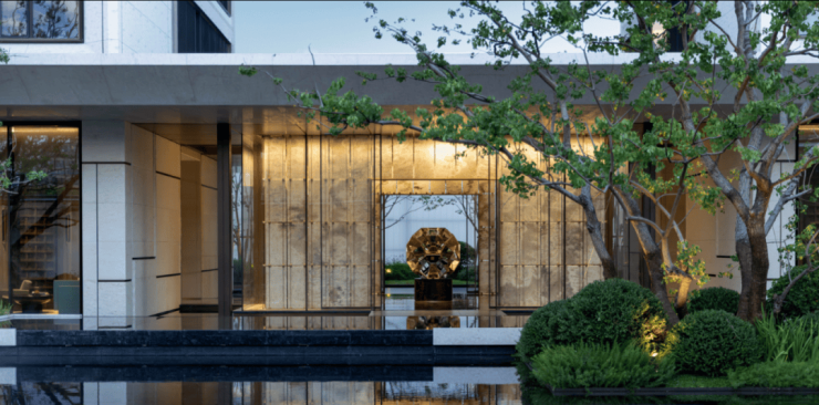 建筑立面上,源自罗伯特・斯特恩古典风格的现代转译,融入蒙迪里安格构手法,以质感石材、鎏金铝板与大面积玻璃的精妙组合,搭配独墅感框景序列,既彰显古典的厚重与尊崇,又兼具现代的简约与通透,成为城市天际线中一道独特的风景。