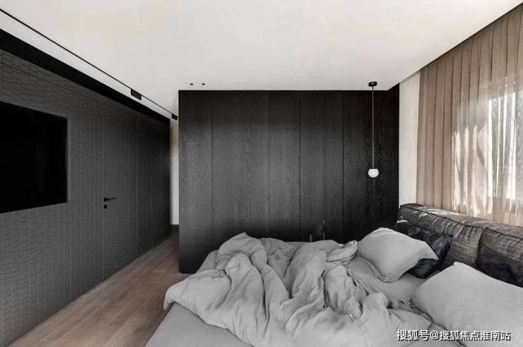 The design of this bedroom is concise and do not break sweet, the wall of warm gray lets the space appear more pure, do not have any redundant adornment. The line feeling of the droplight of the head of a bed is full, send out a downy yellow light, added a warm meaning for whole space. The design of the walk-in cloakroom is very practical. The reasonable layout makes it very convenient to take the clothes, bringing a comfortable experience to the owner. The whole bedroom is not only simple and generous, but also full of practical functionality and warm atmosphere, it is a very comfortable and livable space.