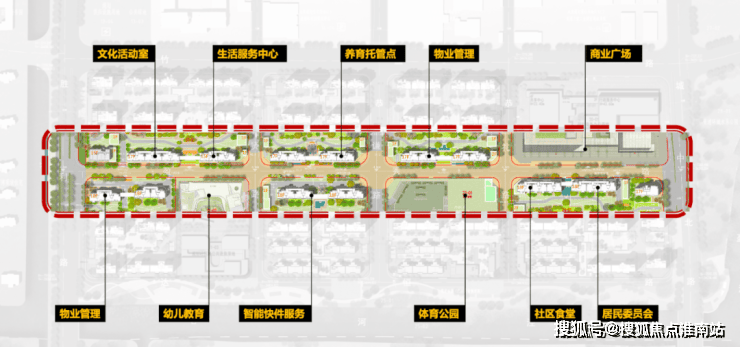 一轴:幼儿园、体育公园、快递驿站、文化活动空间等