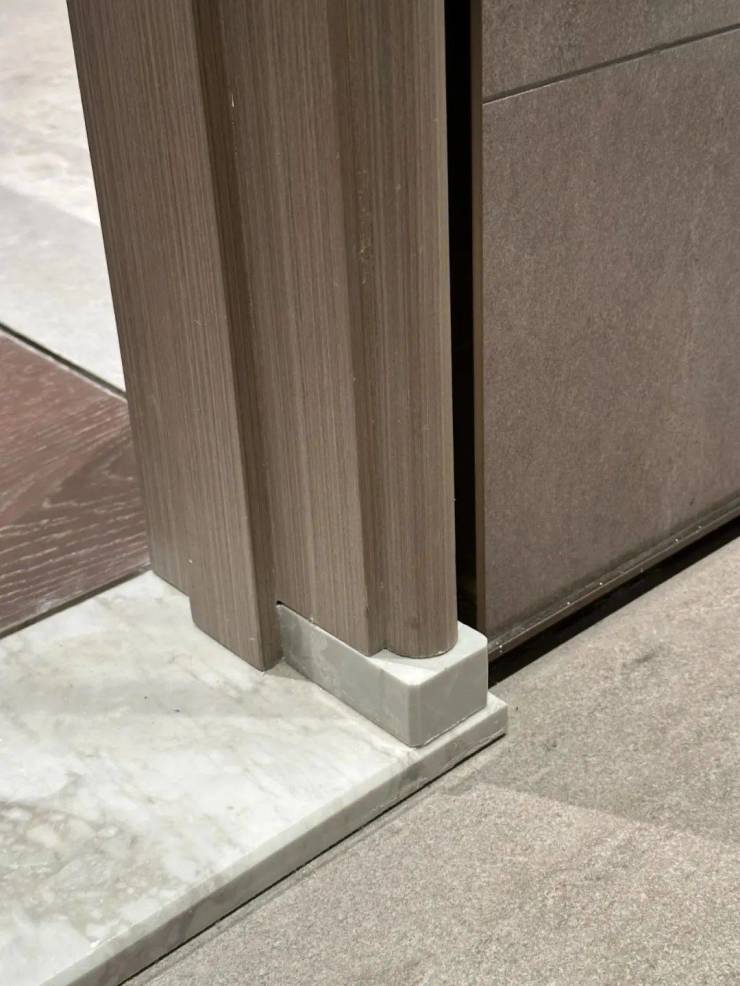 你们可以看下缦云上海是如何处理卫生间木门的防潮的—— 卫生间一侧用大理石做踢脚线, 这是真正细致入微的巧思!