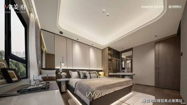 江湾金茂府售楼处电话☎:400-998-9694 主卧背景墙内嵌金属线条,既是点睛装饰,又巧妙拉伸空间纵深感。