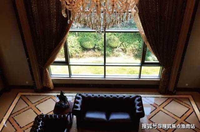 会客室东侧,则是客厅区域,位于该户型中心位置,正朝南,无梁无尖角,面宽6米,不算走廊则进深6米,挑高8米,呈正方形,并配以超大面积的落地玻璃,保持了充足的日照采光,整体显奢华大气。