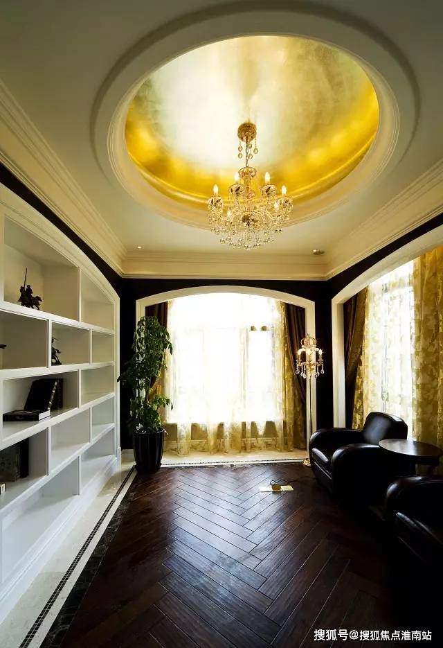 楼梯采用顺时针螺旋设计,寓意顺气,暗含财运事业平步青云,楼梯顶部为屋顶挑高艺术穹顶,可悬挂大型吊灯,气派华丽。