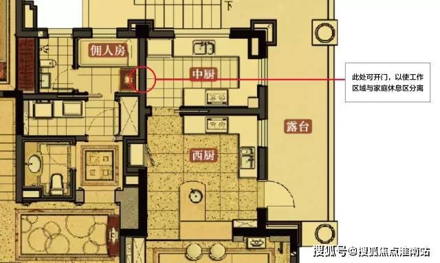 厨房,家庭室以北,总面积近25平,与15平的露台相连,保证了采光通风,并由隔墙分割成中厨和西厨,靠近家庭室的为西厨,无油烟。整体看,厨房区域位于整套房屋的东侧,东方属木,厨房属火,木生火旺,寓意主人红红火火。