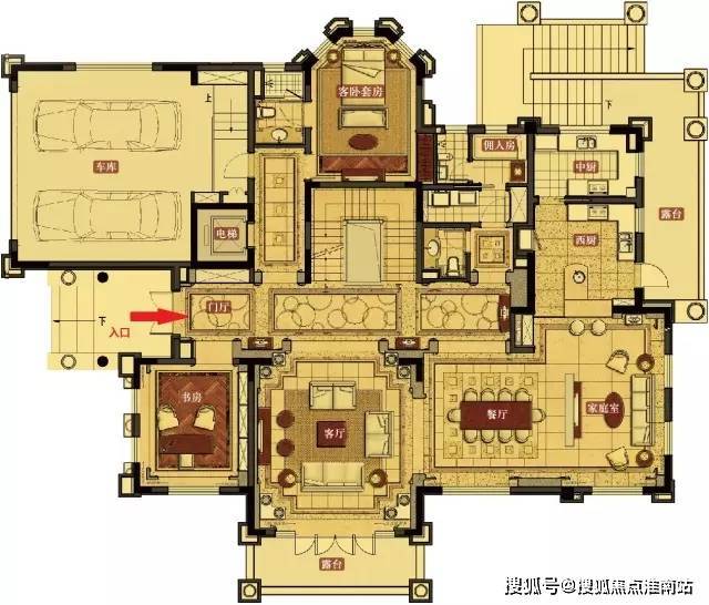 合生东郊别墅实景一层户型鉴赏一楼层高3.8米,设有一个套房、一个书房,客厅、中西厨、餐厅与家庭室、佣人房……整个房型四面采光无死角。