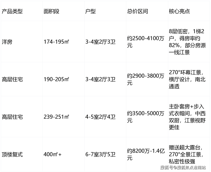 特色设计:南偏东21°黄金倾角布局,最大化江景视野;西低东高规划,前排洋房无遮挡观江;社区内设空中泳池、中央绿地、健身步道等高端配套