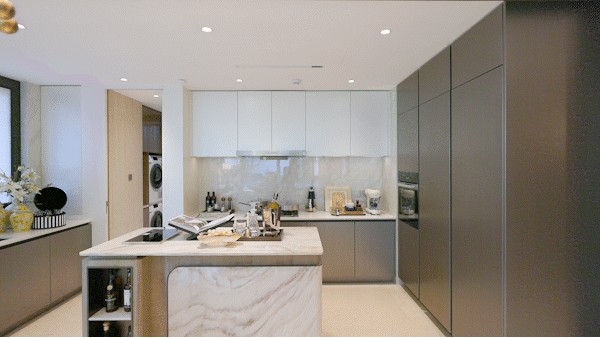 厨房U型设计 ,自带岛台空间, 独立家政间 位于在厨房一侧,洗衣、储物全收纳,让家务动线与生活动线完美分离,不占用核心生活区空间。