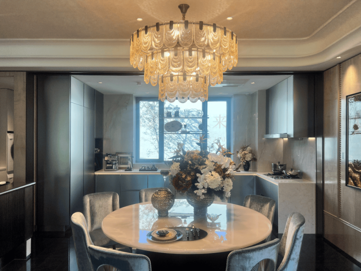 中西双厨+三阳台: 社交中岛与实用中厨分离 ,满足家庭聚会与日常烹饪的不同场景。三阳台设计最大程度引景入室,拓展活动空间。