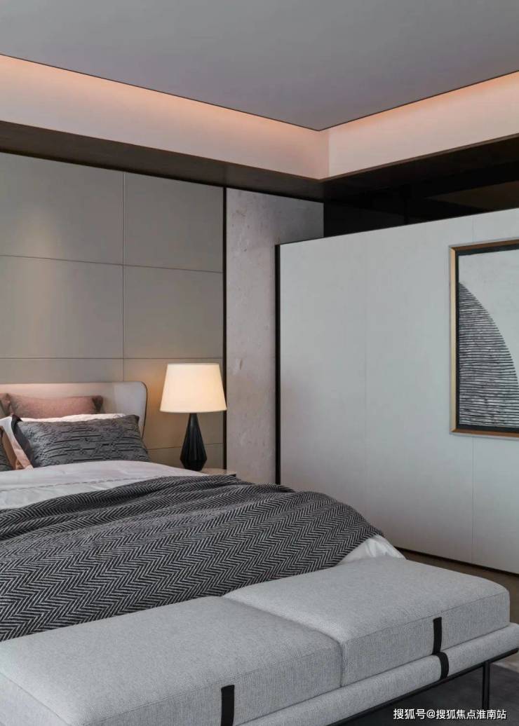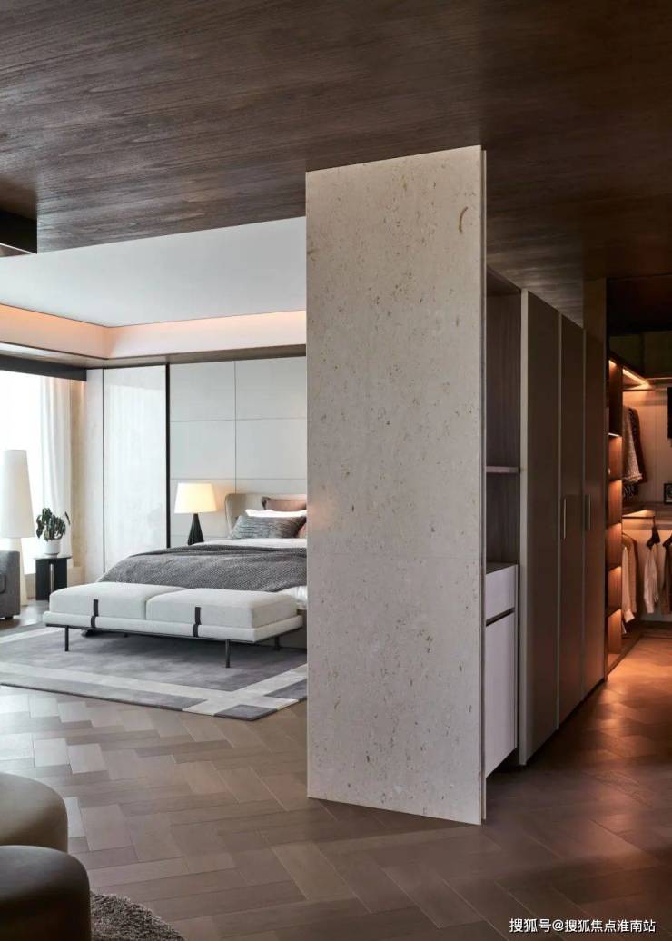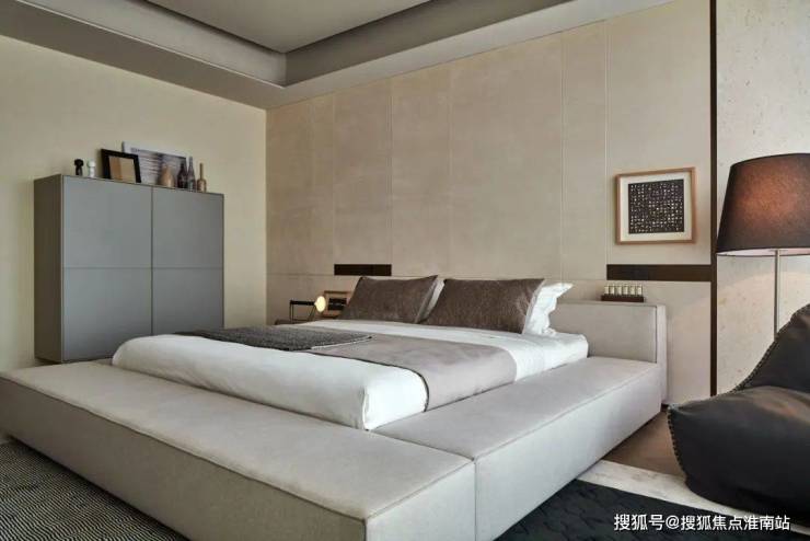 主卧套房面积75平方米,并与东南向的露台相连。以意式现代为基调,家具简洁利落,床头柜来自意大利品牌Molteni&C,榻与落地灯的组合将视线往窗边延伸。