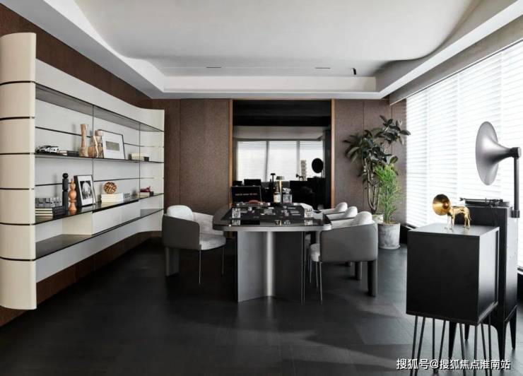 靠窗打造卡座与书桌融合的整体家具,黑白摄影作品与整体色调呼应。音乐、摄影与设计,本就为艺术的不同表现形式。播放一曲音乐,坐在窗边品读一本书,在好的环境中涵养性情。