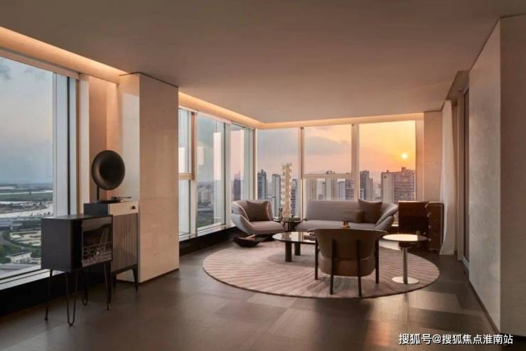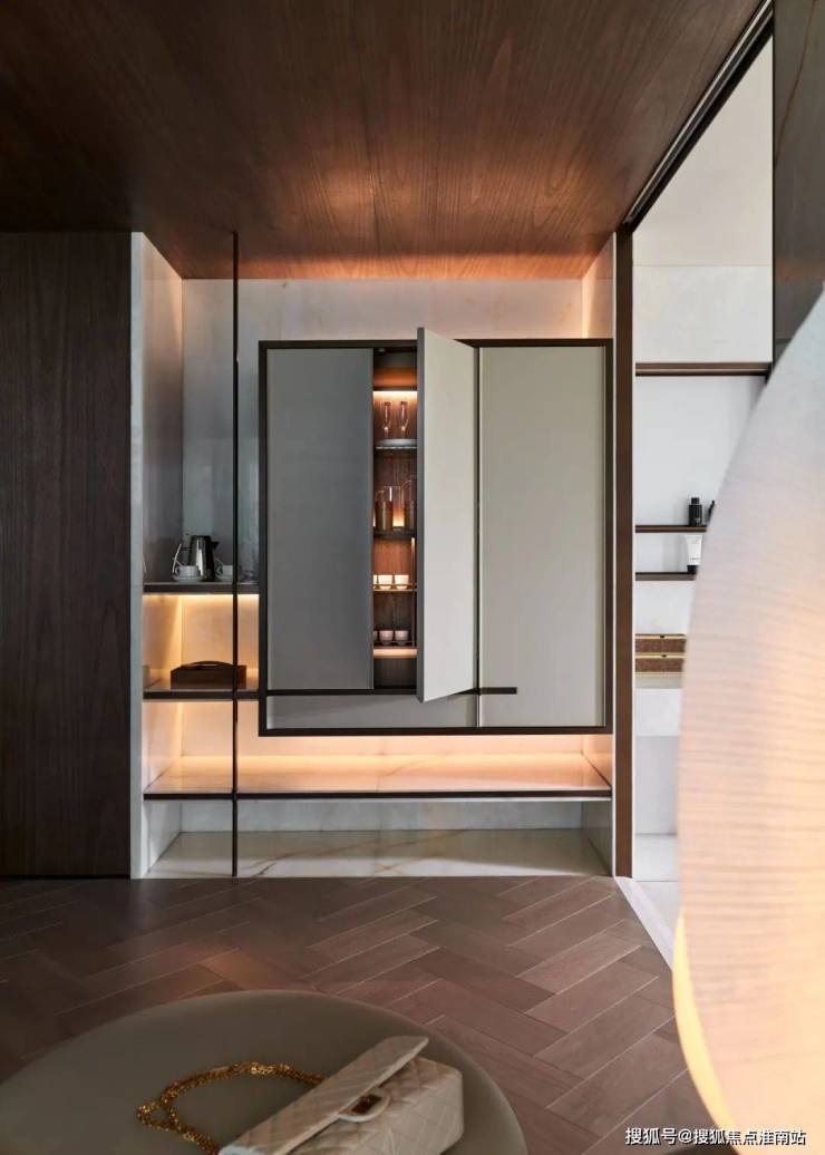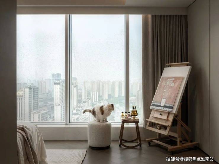 女主人私属空间中贯穿弧形元素,彰显优雅格调。展示柜集成mini吧功能,书籍、艺术画作、茶具花器等分门别类陈列,透露出生活的真意。拉开卷帘,两面落地窗外的天空与江景辽阔。