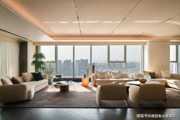 是日常居所,也是家庭生活方式的表达,是生活圈层和社交圈层的象征。一览众山小的绝佳视野,从露台延伸至客厅的绿植,沁人心脾。客厅布局运用了三组沙发,在不同的社交模式下,它们适配不同的组合,来满足豪宅空间的社交设计法则。