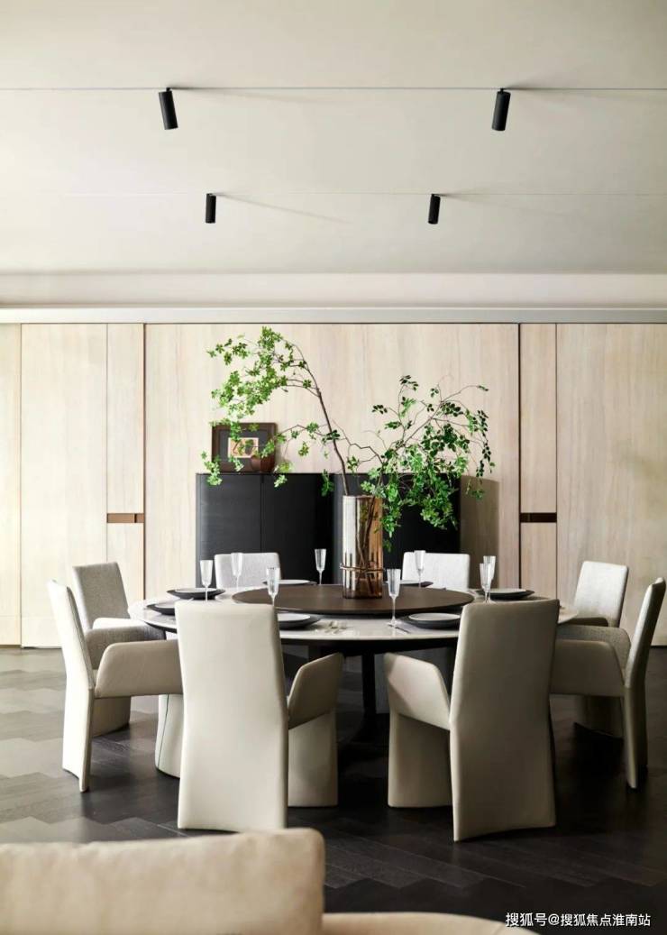 “圆”,是中国文化的一个重要精神原型,圆桌蕴含团圆之意,餐厅也是中国家庭交流情感的重要场所。十人位圆桌搭配与客厅沙发同色系的皮革单椅,满足家庭日常用餐及节假日的友人聚会。Poliform餐边柜以简约的设计和大容量的储物,实现功能与美感的统一表达。