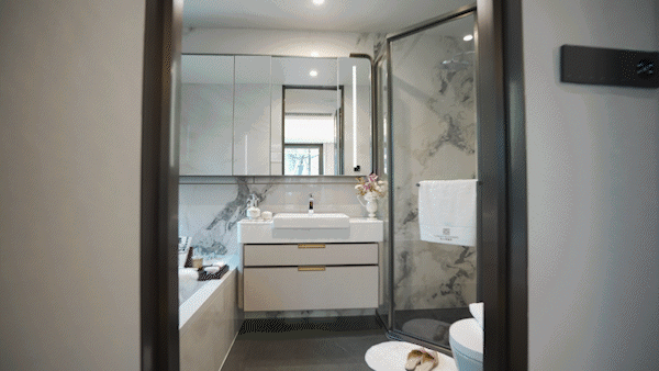 项目整个餐客厅均为 岩板 交付,岩板的尺寸达到了2.4米*1.2米,这是市面上非常罕见的大板配置,即便是市区豪宅,用的大尺寸也不过是1.8米!