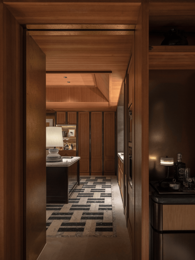 整体布局采用向心式的“打开”策略,会客区使用木地板拼花,私宴区则使用更符合场景的石材拼花。