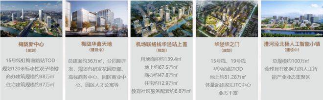 梅陇新中心:围绕15号线虹梅南路站,以TOD理念打造功能无缝衔接的综合枢纽,沿景洪路两侧打造约120米城市高地,沿春申塘打造滨水地标,优化基础教育和公共服务布局。