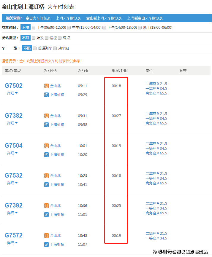 查询火车时刻表可以看到,金山北站到大虹桥核心枢纽只有1站,通勤时间远远低于十几站且站站停的地铁。