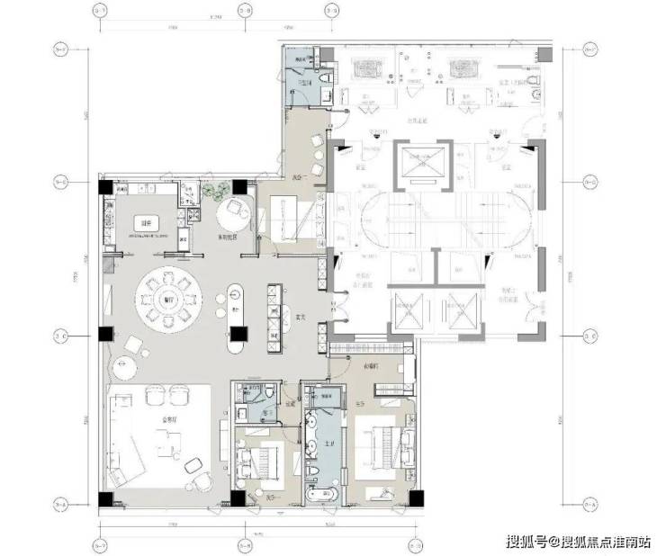 中间套的客餐厅更是达到约100㎡,一张12人的大圆桌也有充足的空间优雅转身。周末约上好友来聚会,给主人赚够了颜面。