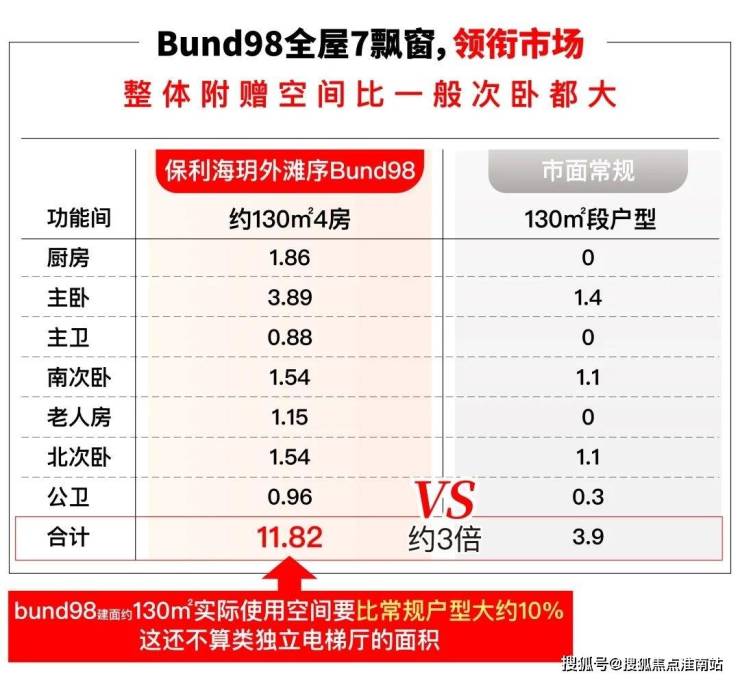 相比常规户型只是全卧飘窗布置,Bund98户型不仅厨房带飘窗,主卧和两个卫生间更带双侧采光的270度飘窗,总共七个飘窗,飘窗不计入建筑面积,附赠远超常规户型。