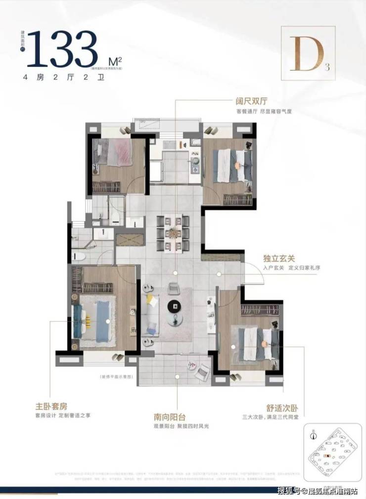 户型空间更大化 全大宅生活尺度建筑面积约93㎡-133㎡多样精致户型设计,满足不同人居需求。建筑面积约93㎡户型做到三房两厅两卫,比别人“多一卫”的设计,让三代同堂依然从容有度,更高性价比收获大宅生活感。让空间功能性、舒适度足以媲美市面上100㎡+户型。南向三面宽,拥有更多采光面,LDK一体化,打破空间界限,生活大有享法。